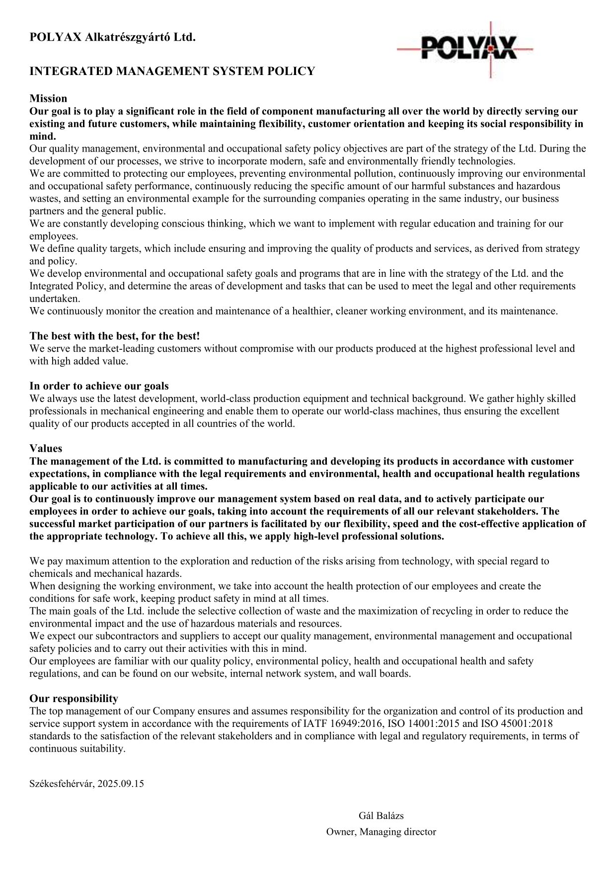 Cégünk már 2002-ben megszerezte az MSZ EN ISO 9001:2001 szabvány szerinti minősítést a „Precíziós alkatrészek forgácsoló megmunkálása” érvényességi területre. 2014 áprilisában a Polyax Kft. elnyerte az ISO/TS 16949 és az ISO 14001-es tanusítványokat, mely a minőségirányítás további erősödését és a környezetközpontú irányítási rendszer kiépítését tanúsítja, valamint cégünk rendelkezik MSZ ISO 45001:2018 tanúsítvánnyal is (MEBIR szabvány).