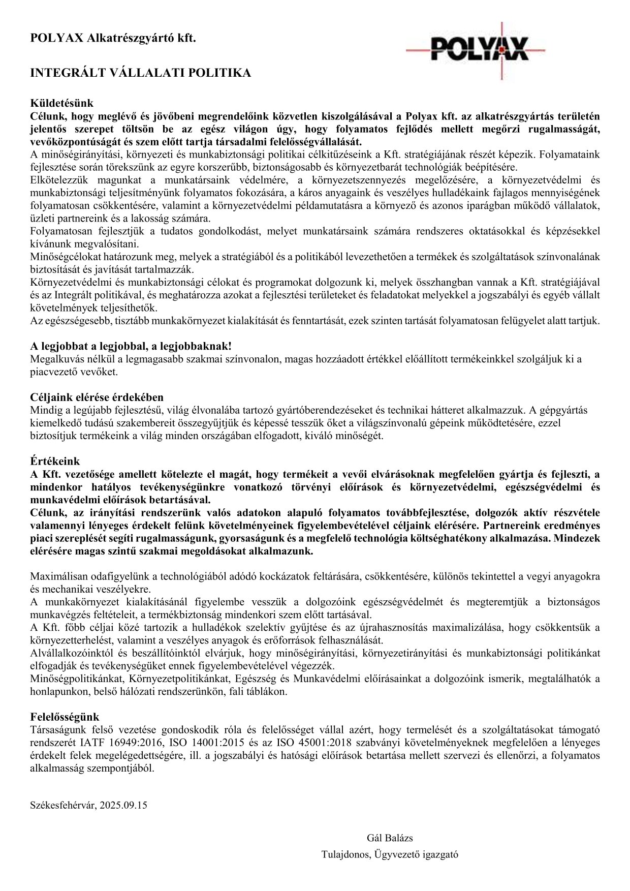 As an evidence of the competitiveness and quality reliability in 2002 we obtained the quality certificate of MSZ EN ISO 9001:2001, as a qualification of “Machining of precision parts”. In April of 2014 Polyax gained the certificate ISO/TS 16949 and ISO 14001:2004, which certifies the more stable quality management and the environmental oriented managing system. Our company also has MSZ ISO 45001:2018 certificate.